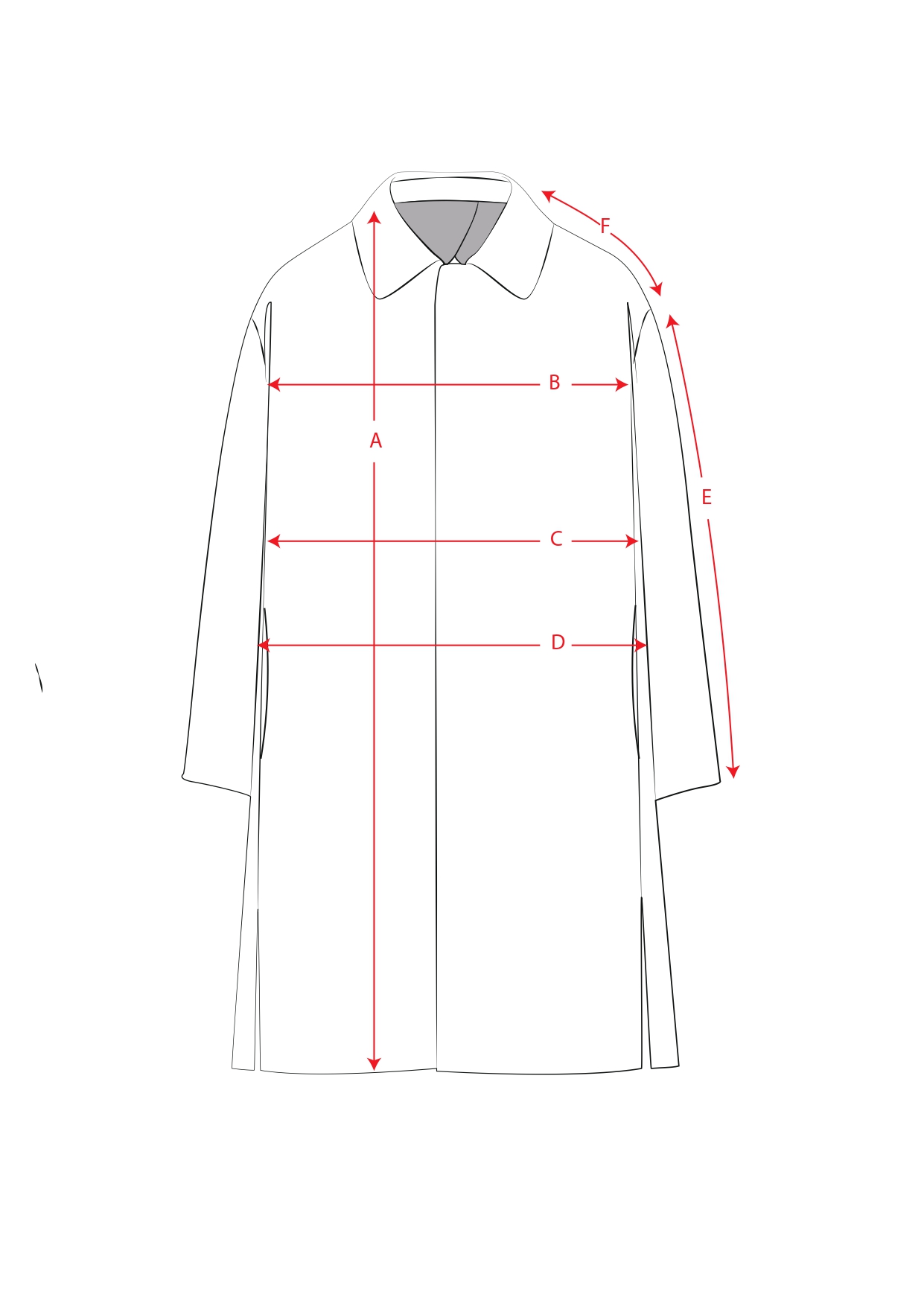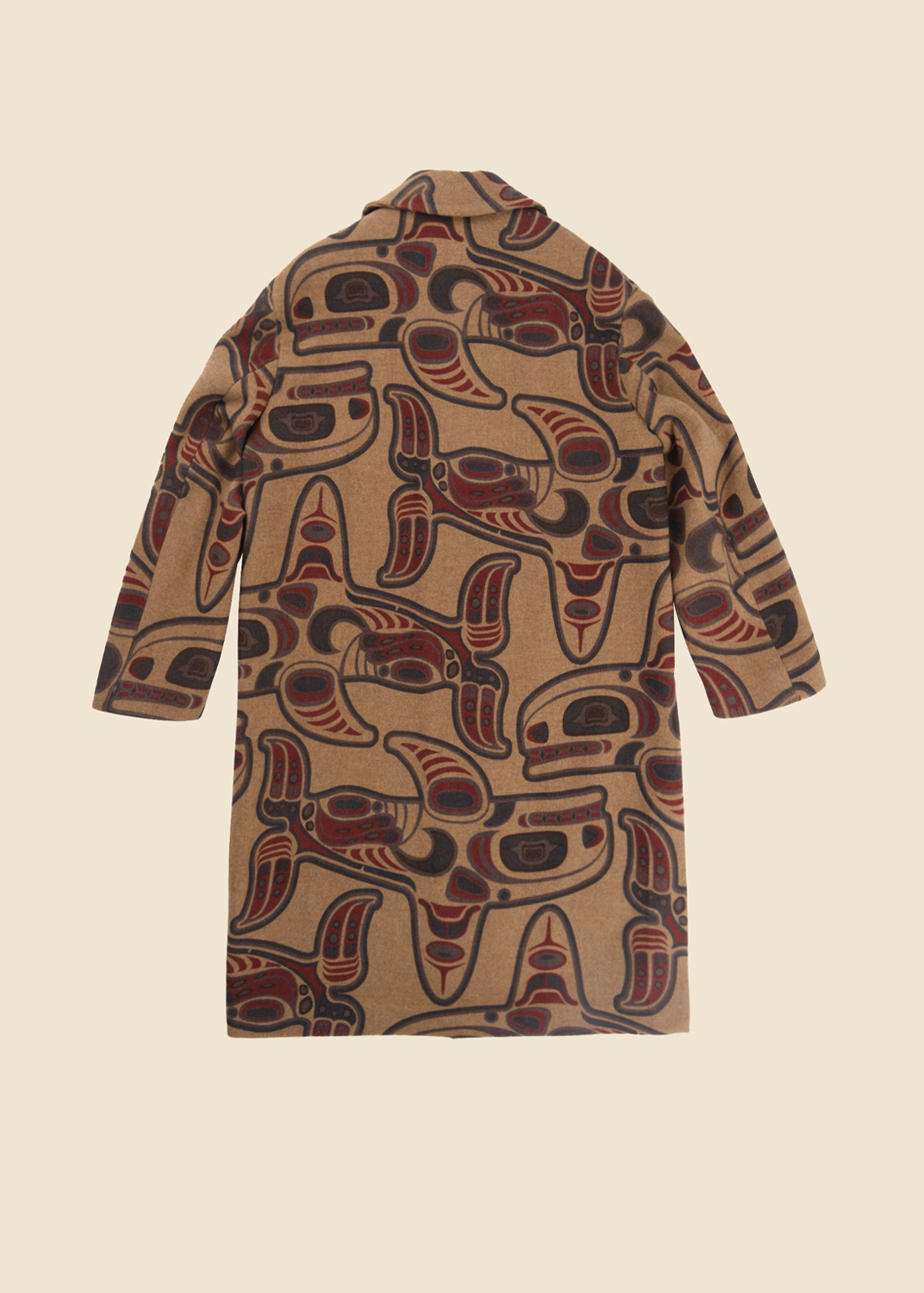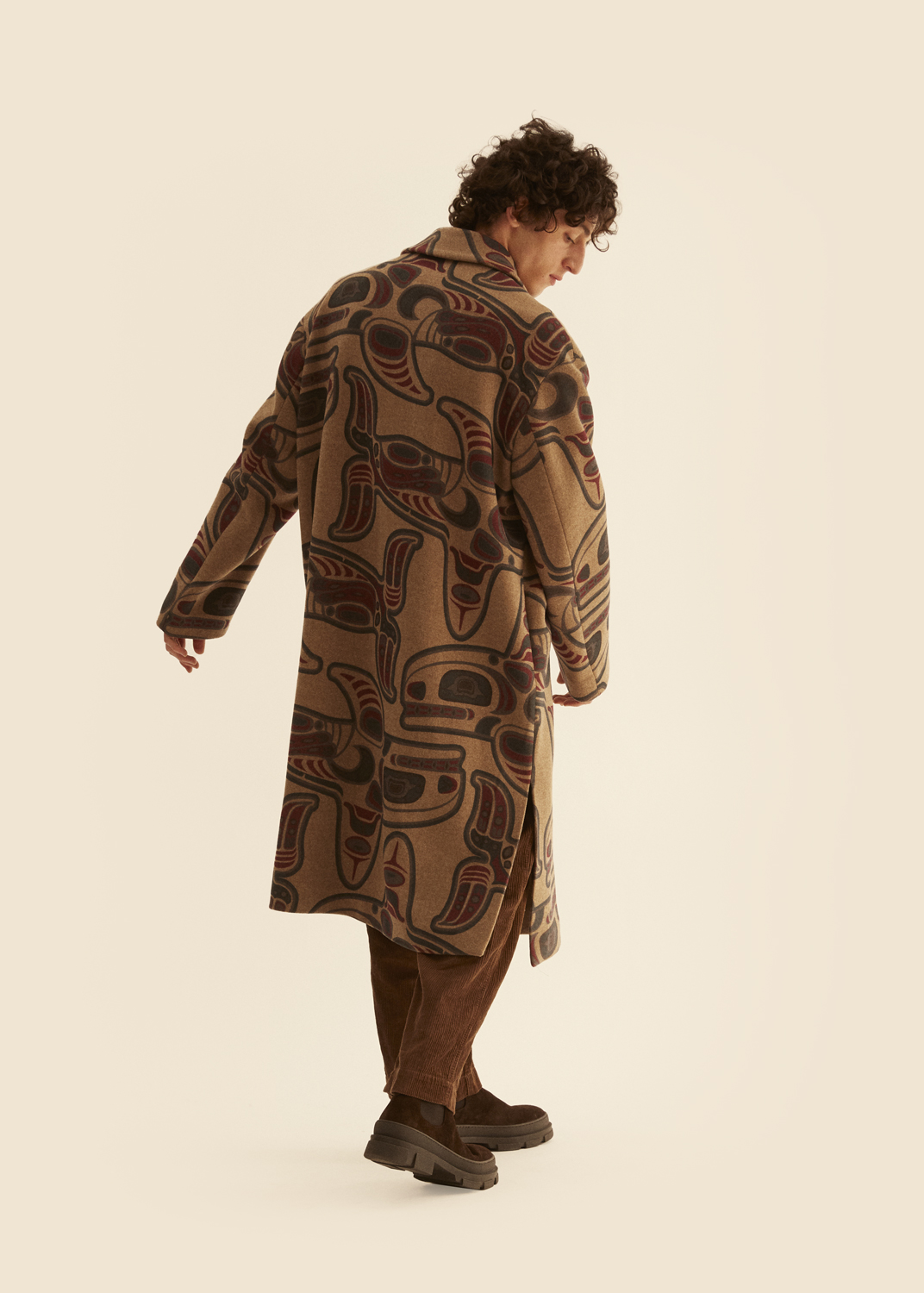 Unlined coat in double cashmere wool, orange interior, with side openings and hand-sewn snap buttons. Inkjet printed with Navajo motifs.